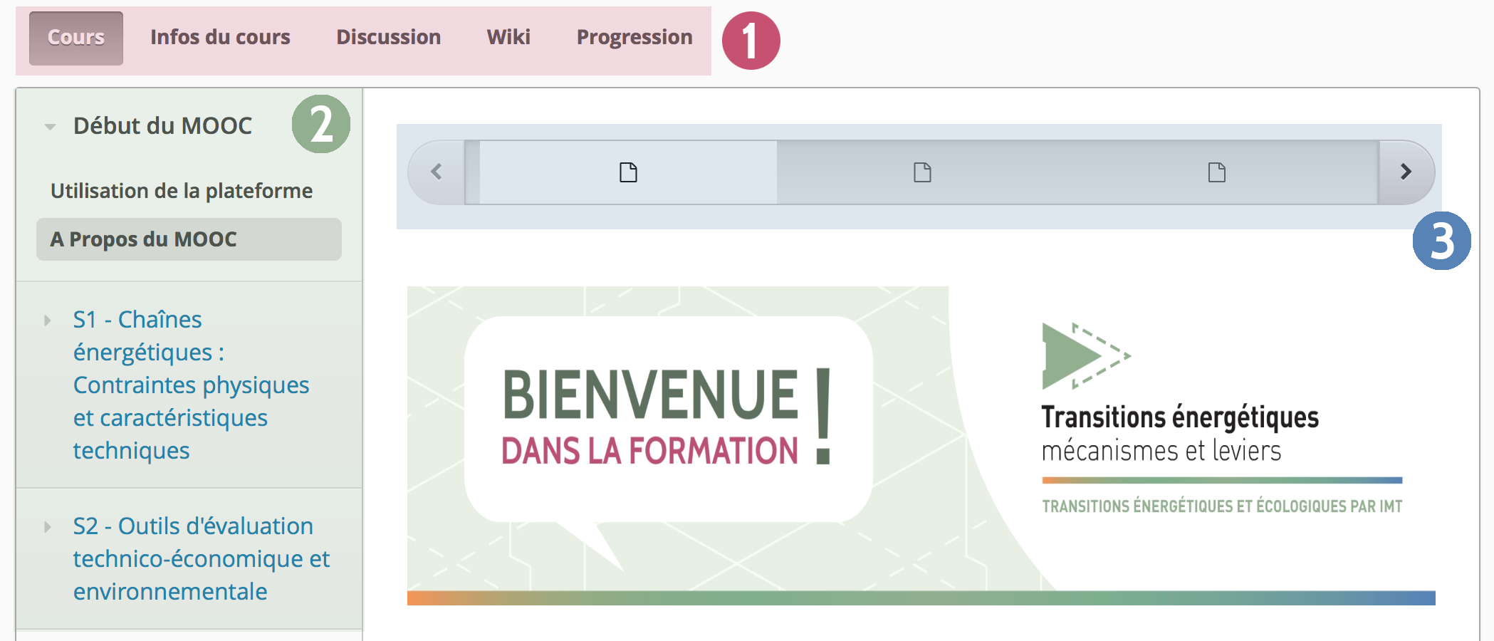 Le Mooc "Transitions Energétiques" est habituellement exploité en mode ouvert et massif sur la plateforme FUN-Mooc et s’appuie sur la technologie openedX. Les sessions en mode privé (Spoc), réservées à de petits groupes d’étudiants sur la plateforme FUN-Campus, présentent une interface rigoureusement identique. Les informations de la présente notice sont valables sur les deux plateformes. Vous disposez de 3 menus pour naviguer.